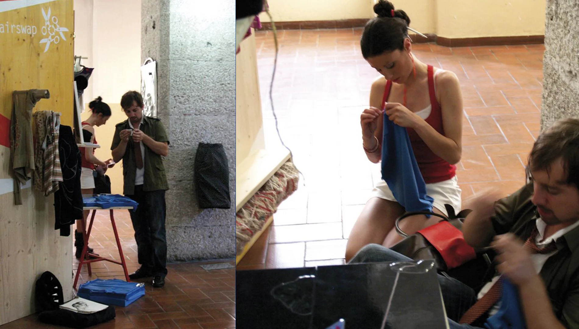 In the airport, inside the AIRSWAP pavilion, the travellers can see the dresses, which are the result of other travellers swapping and that have already been modified, and they can choose the artifact they prefer, swapping it with a piece of their own. Artists will see and modify the dresses. Once the dresses modified, they will be put in the swapping process again.